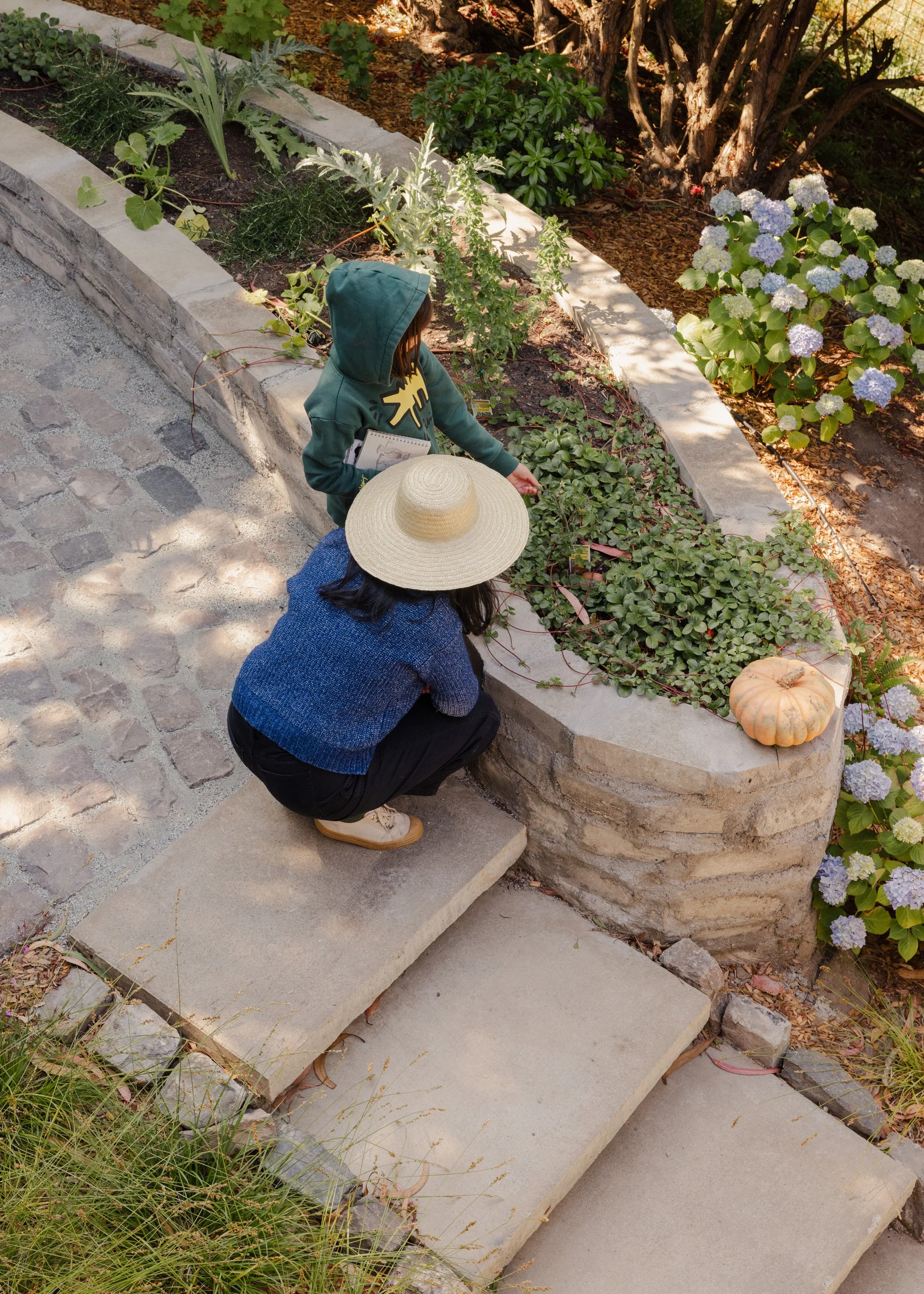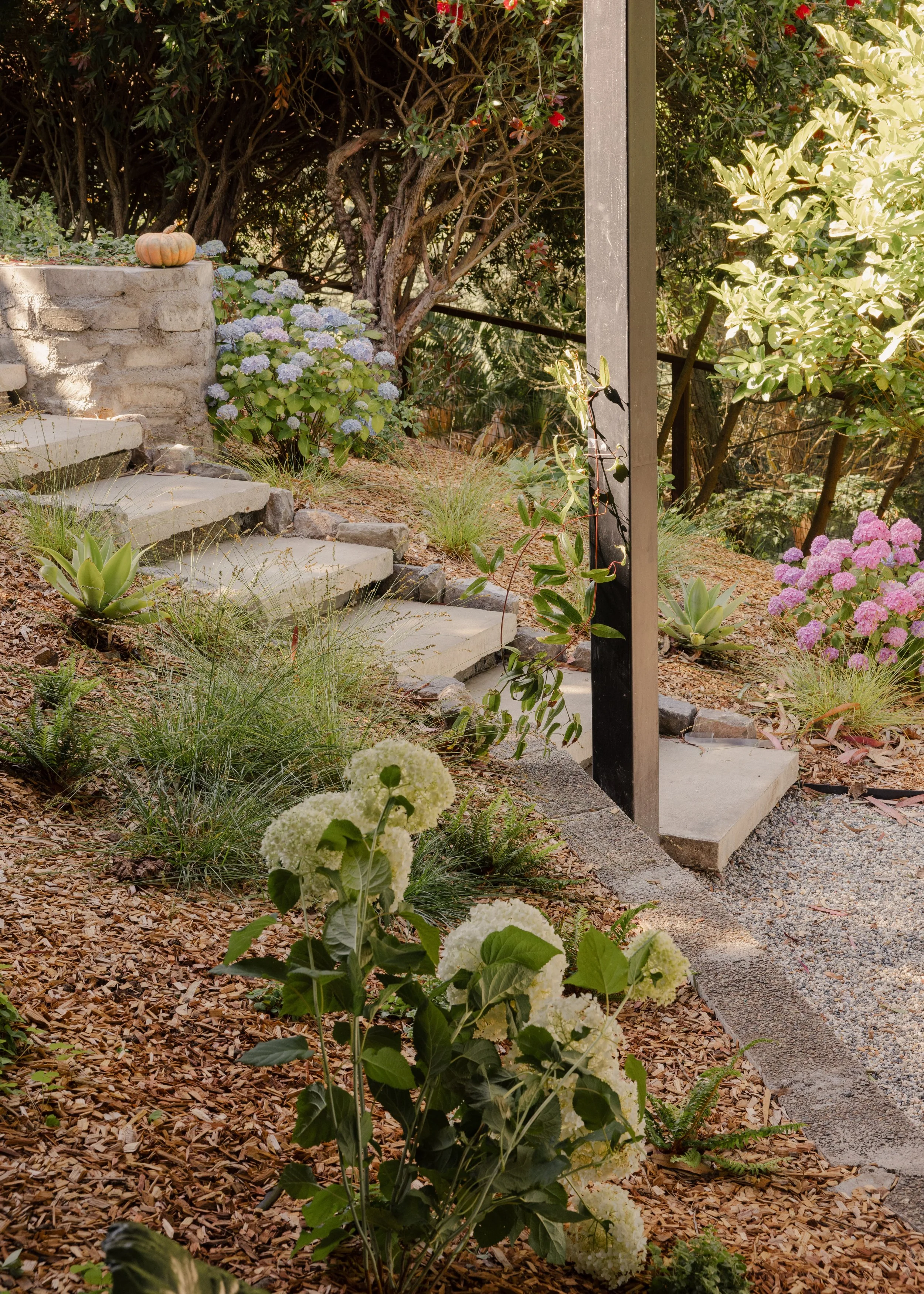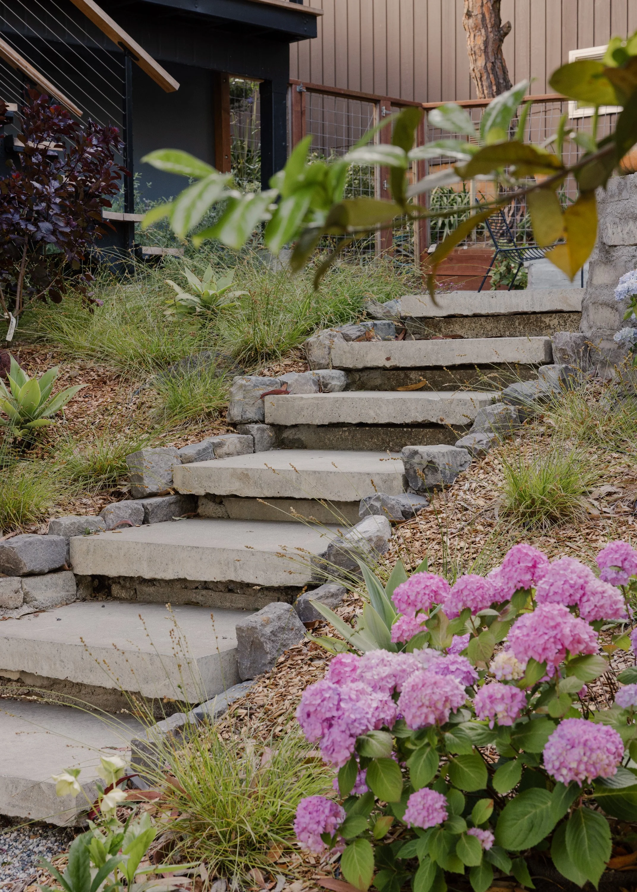 Rather than demolish and dispose of the existing concrete slabs, we cut them into clean segments and reused them to construct garden steps, raised beds, and the bench foundation—reducing material waste and preserving character while significantly lowering costs.