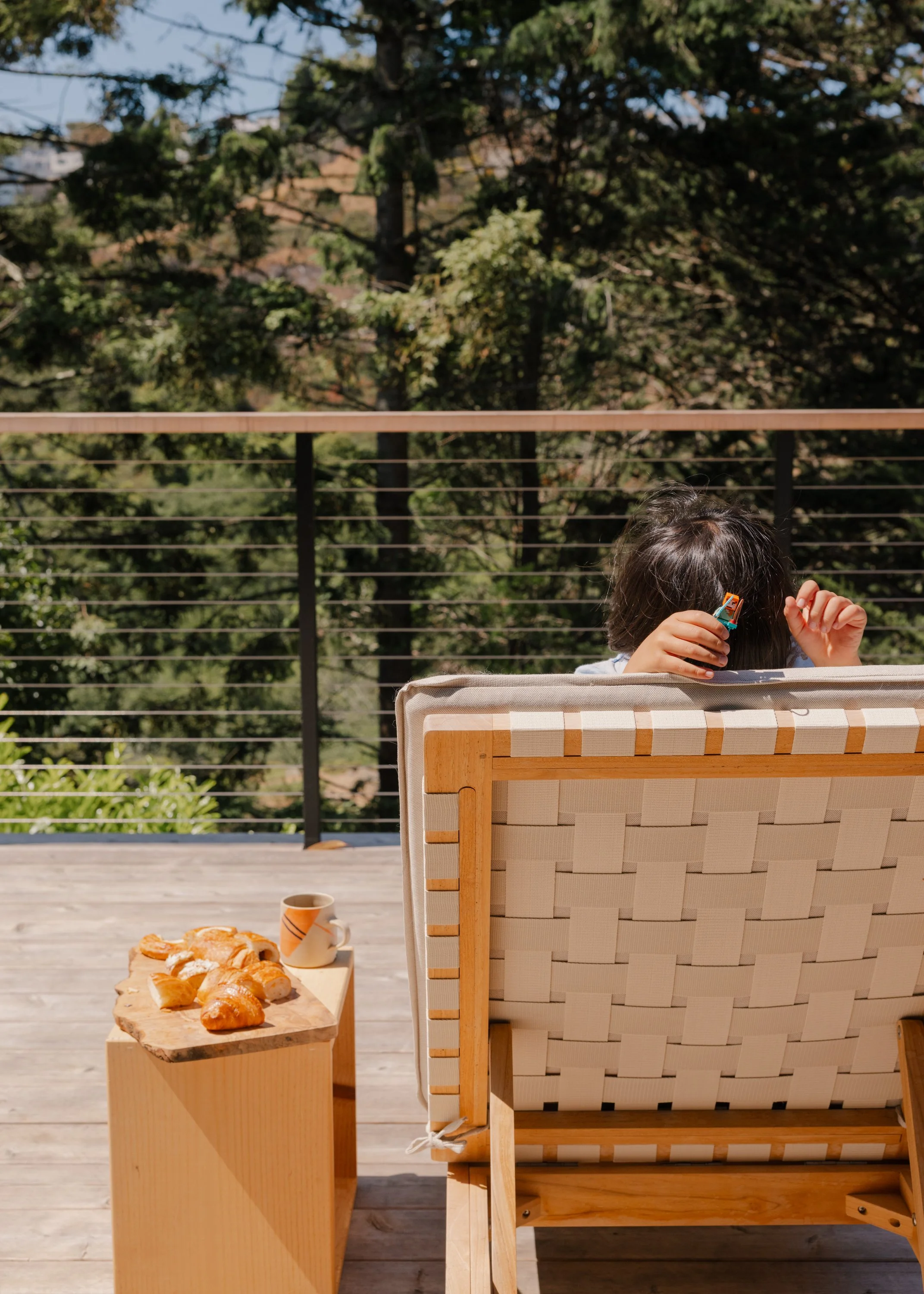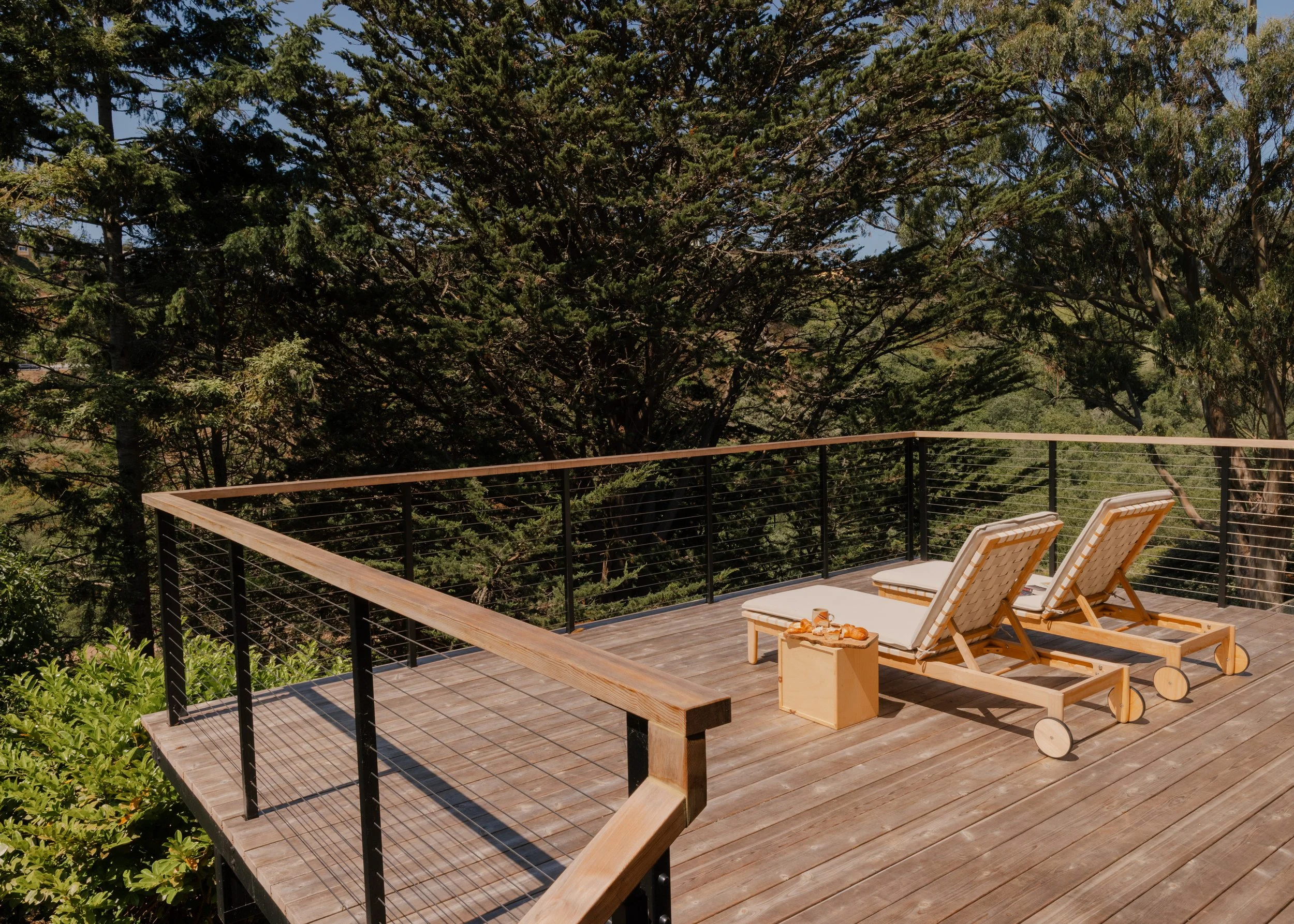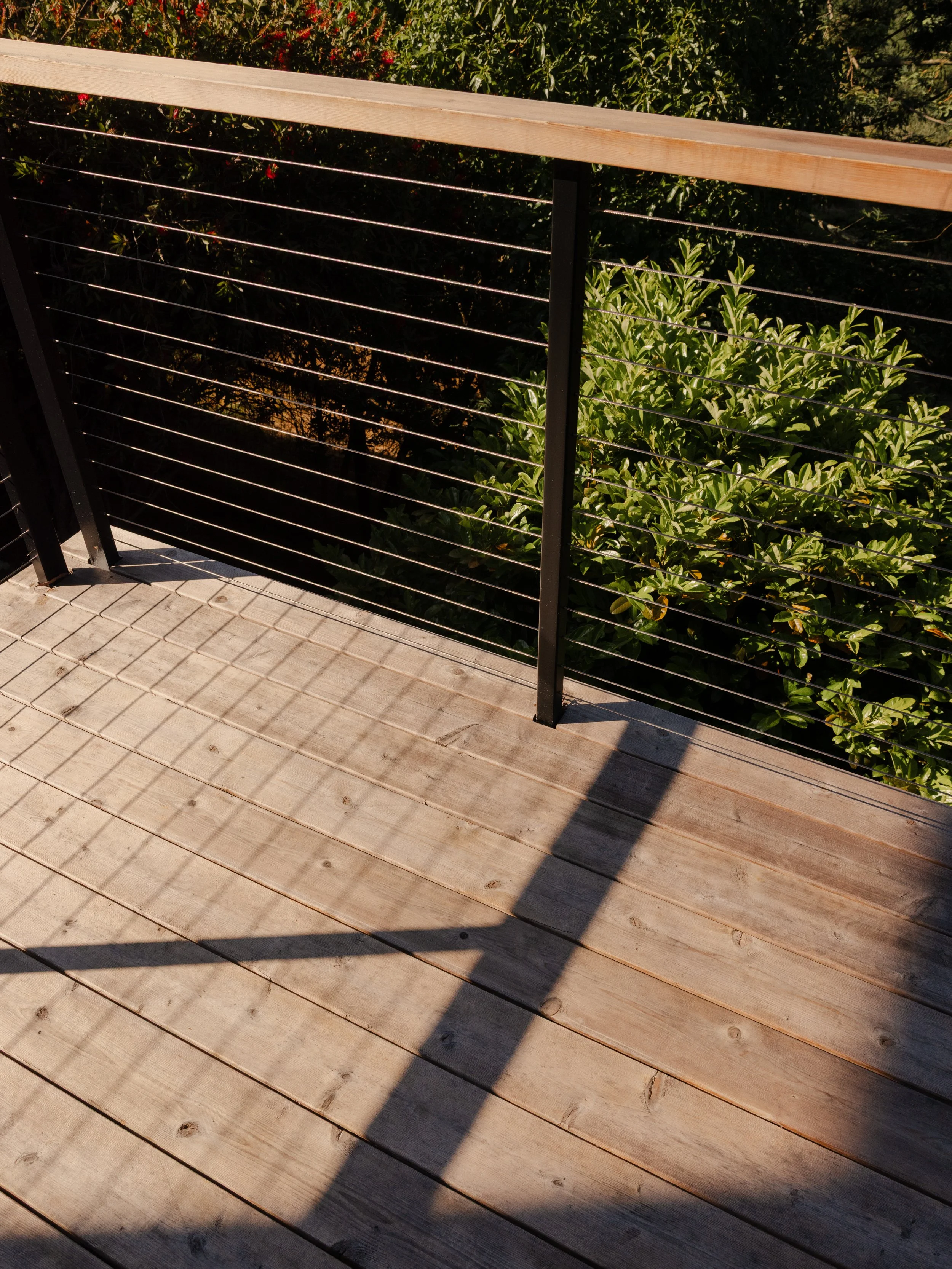 At the heart of the project was the rebuilding of a second-story deck, creating an outdoor living space fully immersed int he surrounding treetops. Constructed with a steel frame from Fortress for long-term durability and topped with knotty western red cedar decking, the deck balances natural warmth with structural integrity while carrying the modern interior aesthetic of the home to the exterior. Cable railings from Atlantis were selected to preserve unobstructed views of the surrounding canopies.