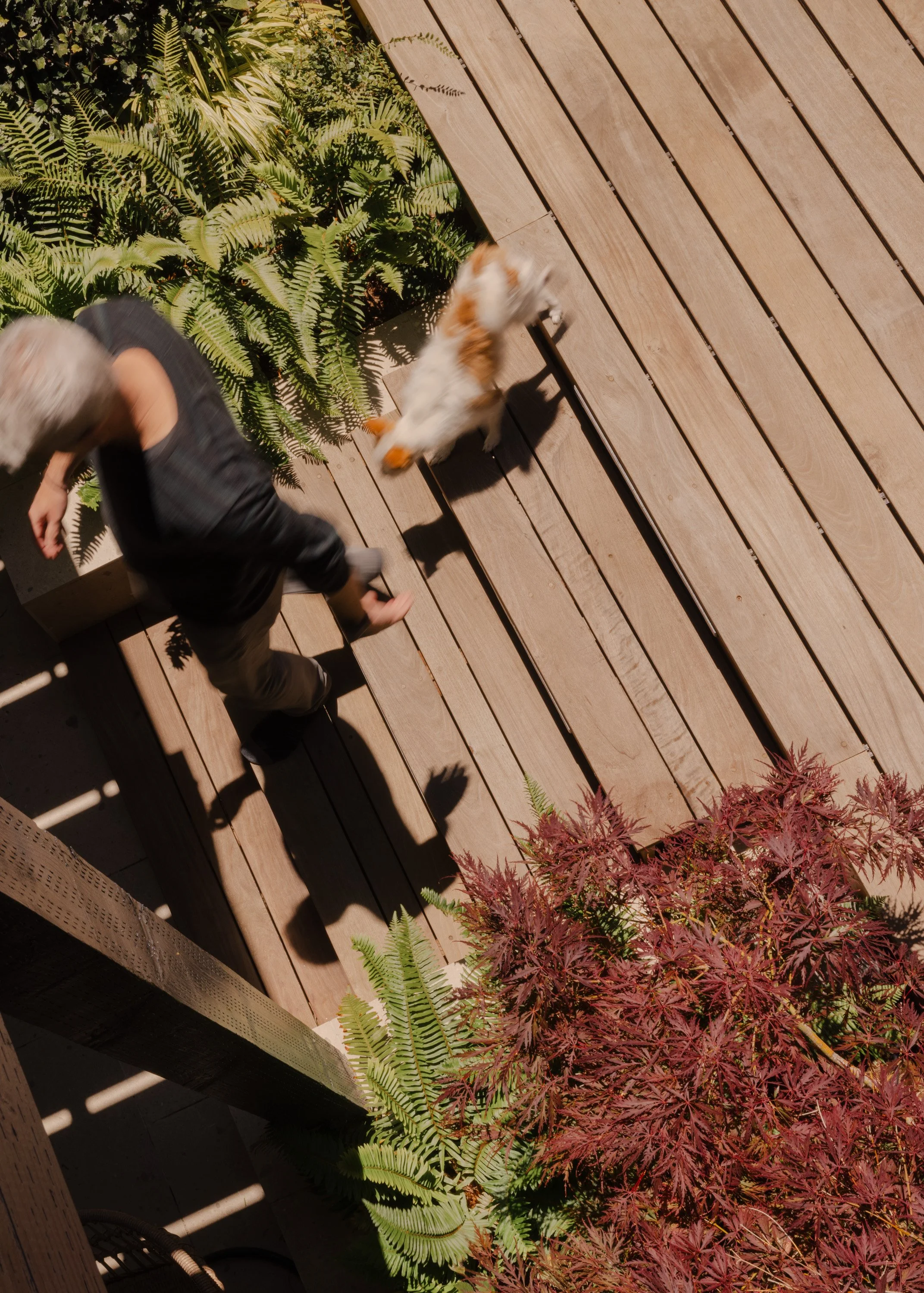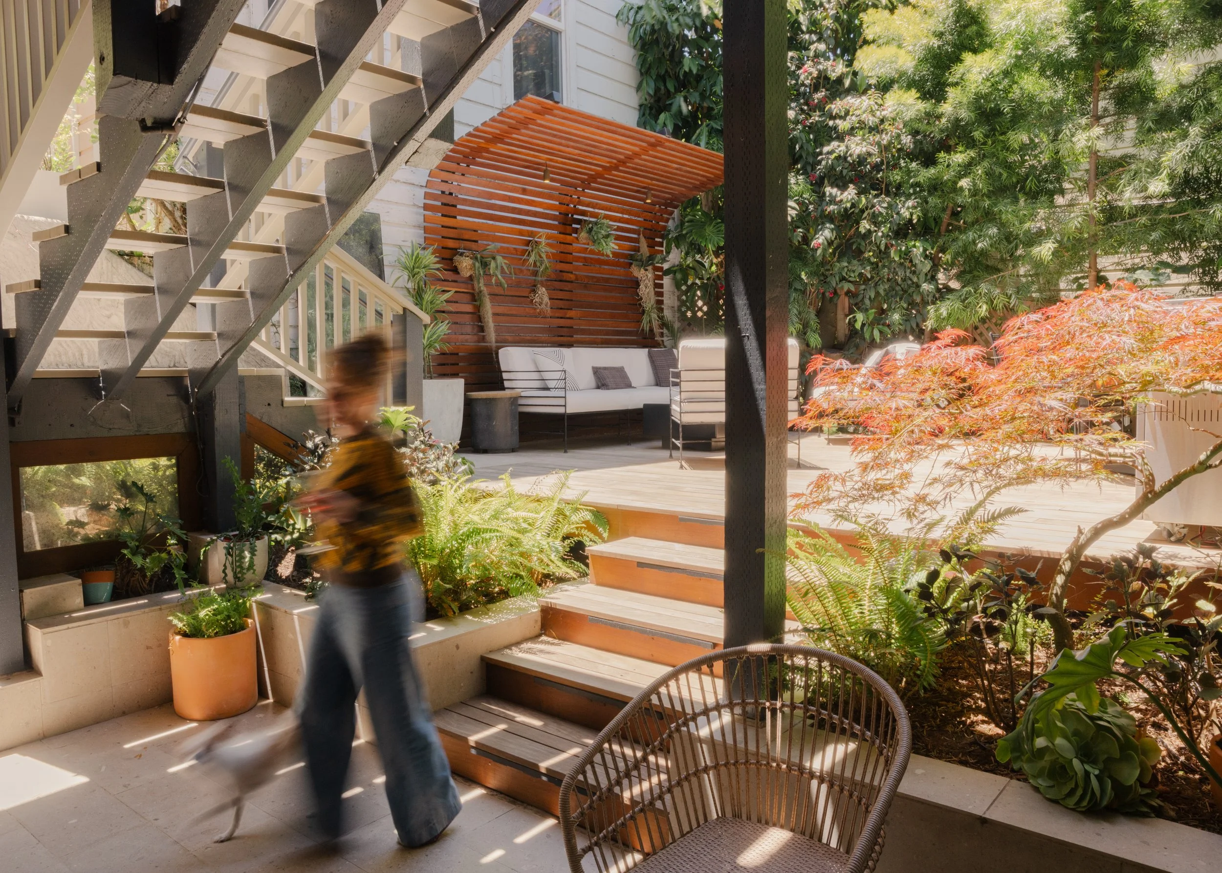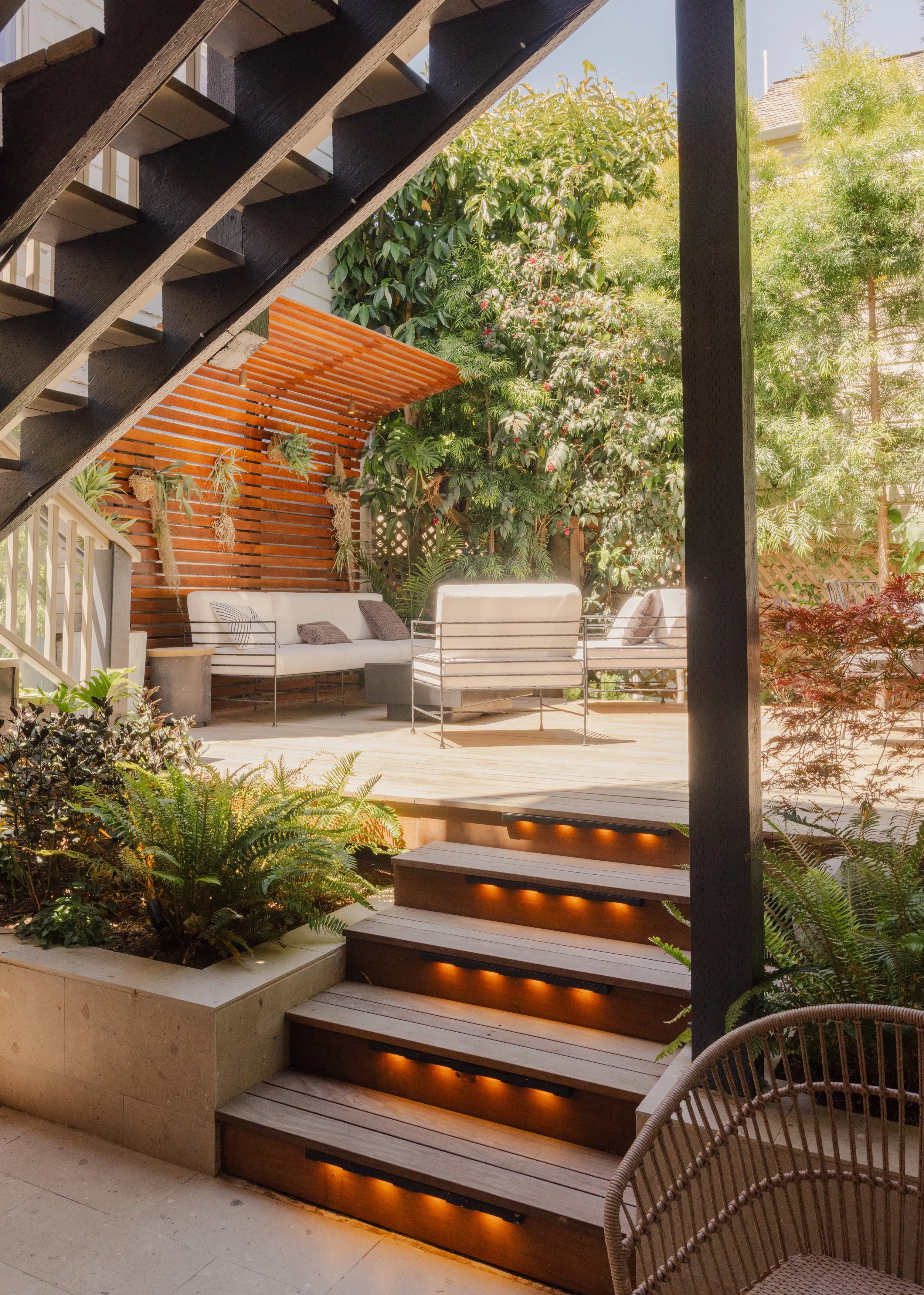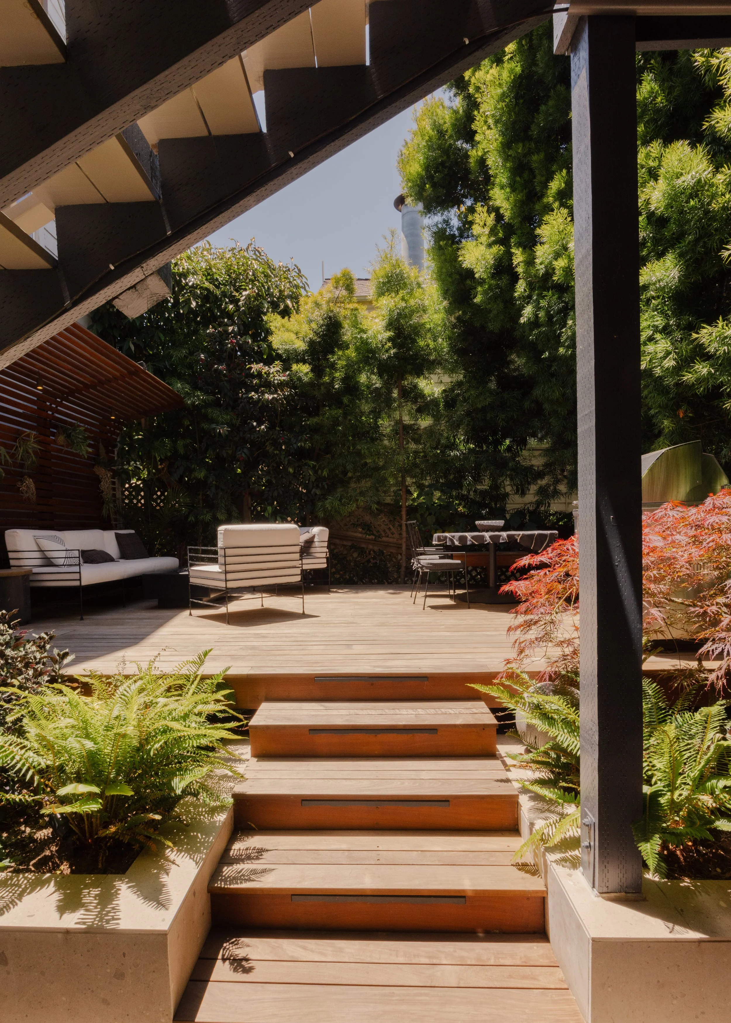 One of the project’s most pivotal changes was structural rather than purely aesthetic - subtractive instead of additive- and it completely transformed how the outdoor space is accessed and experienced from the home. Originally, several bulky posts divided the lower and upper patios, forcing anyone coming from the downstairs recreation room to detour awkwardly around them. After examining the structure and consulting with Mosswood Engineering, we found a way to dramatically improve the flow. By doubling the main span beam, we were able to remove - not one, not two, but three- of the posts. With the staircase at center, the remaining posts now frame the garden’s entry instead of blocking it, creating a seamless transition between indoor and outdoor living.