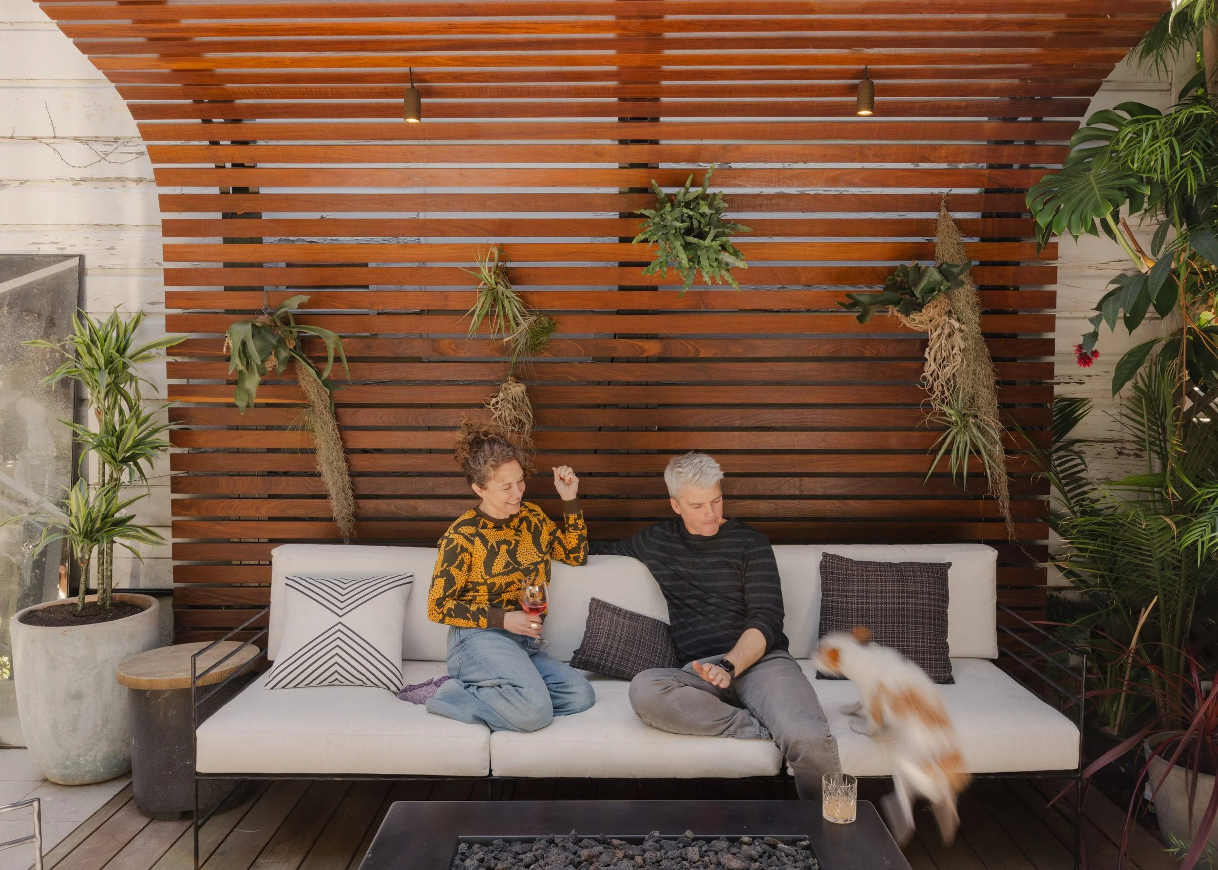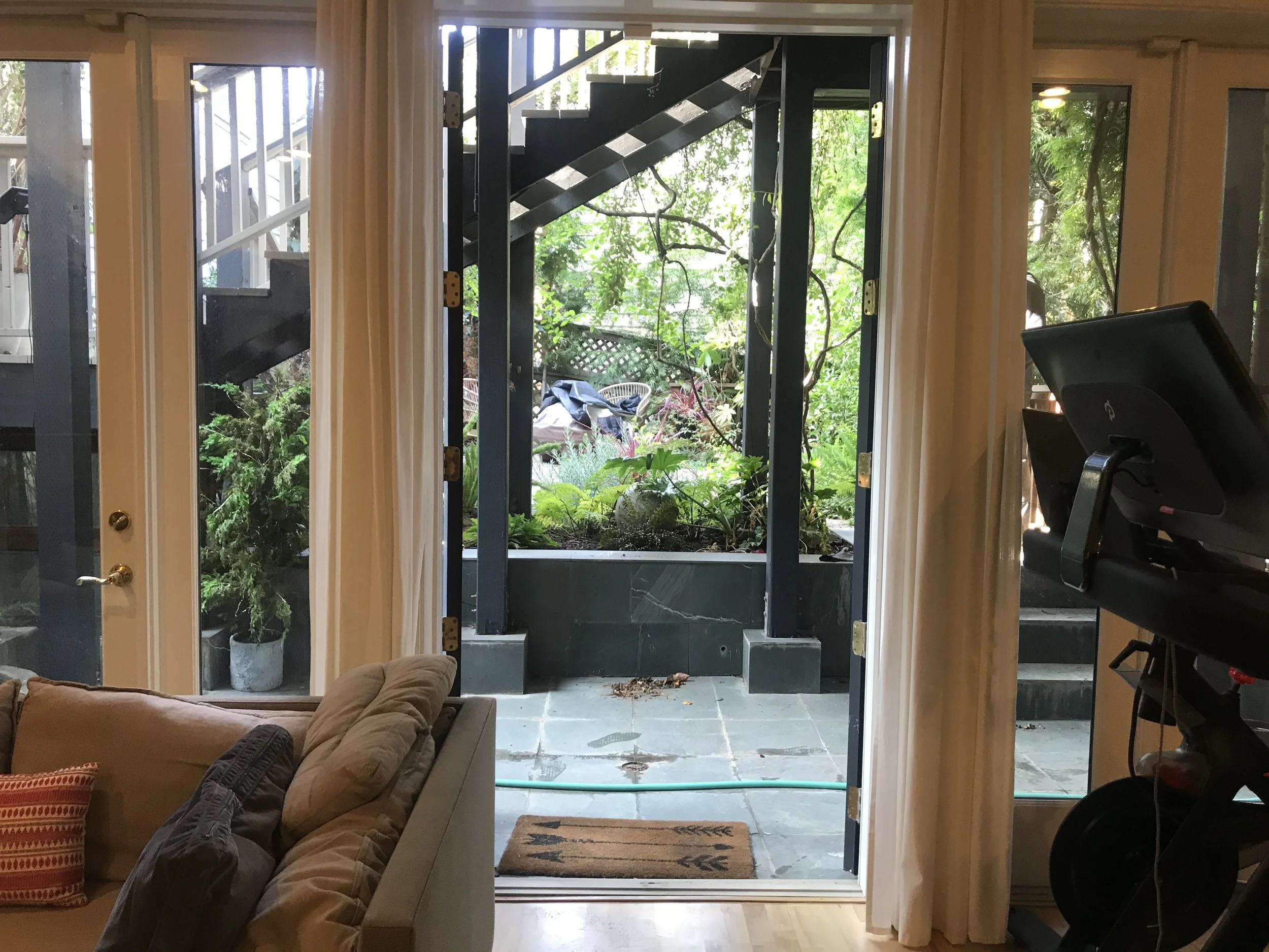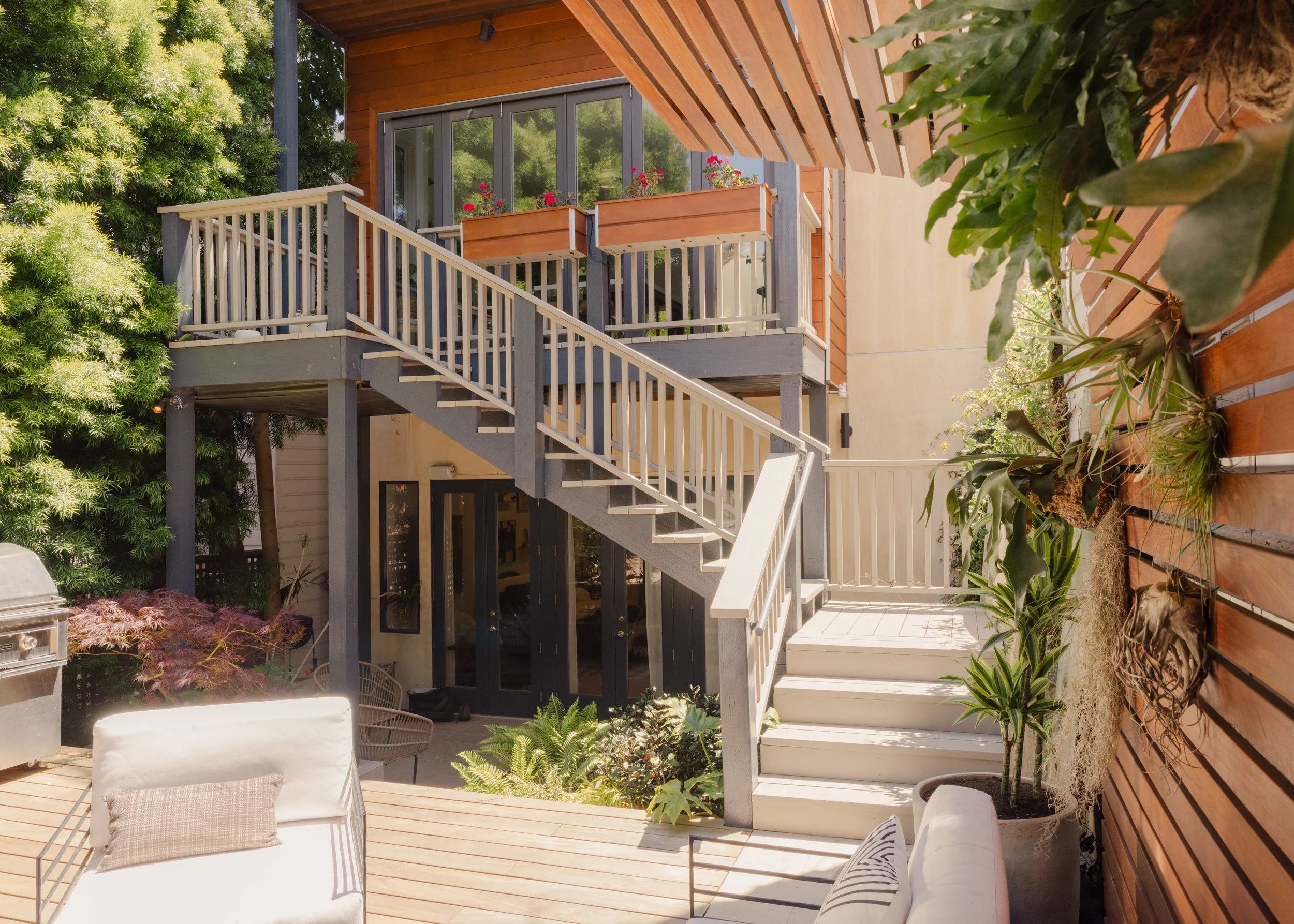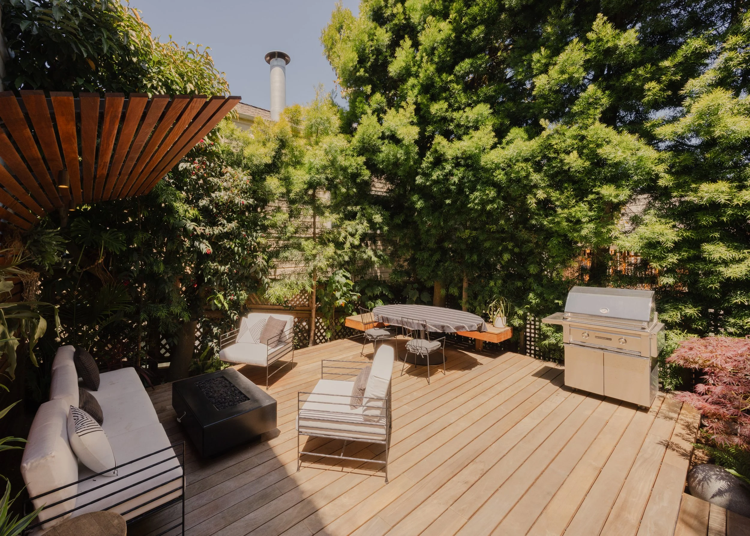 One of the project’s most pivotal changes was structural rather than purely aesthetic - subtractive instead of additive- and it completely transformed how the outdoor space is accessed and experienced from the home. Originally, several bulky posts divided the lower and upper patios, forcing anyone coming from the downstairs recreation room to detour awkwardly around them. After examining the structure and consulting with Mosswood Engineering, we found a way to dramatically improve the flow. By doubling the main span beam, we were able to remove - not one, not two, but three- of the posts. With the staircase at center, the remaining posts now frame the garden’s entry instead of blocking it, creating a seamless transition between indoor and outdoor living.