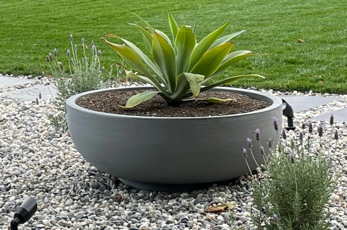 Several varieties of Agave sit in rows and containers frame each area, while more lush broadleaf plants are relegated as a backdrop to the hot tub area.
